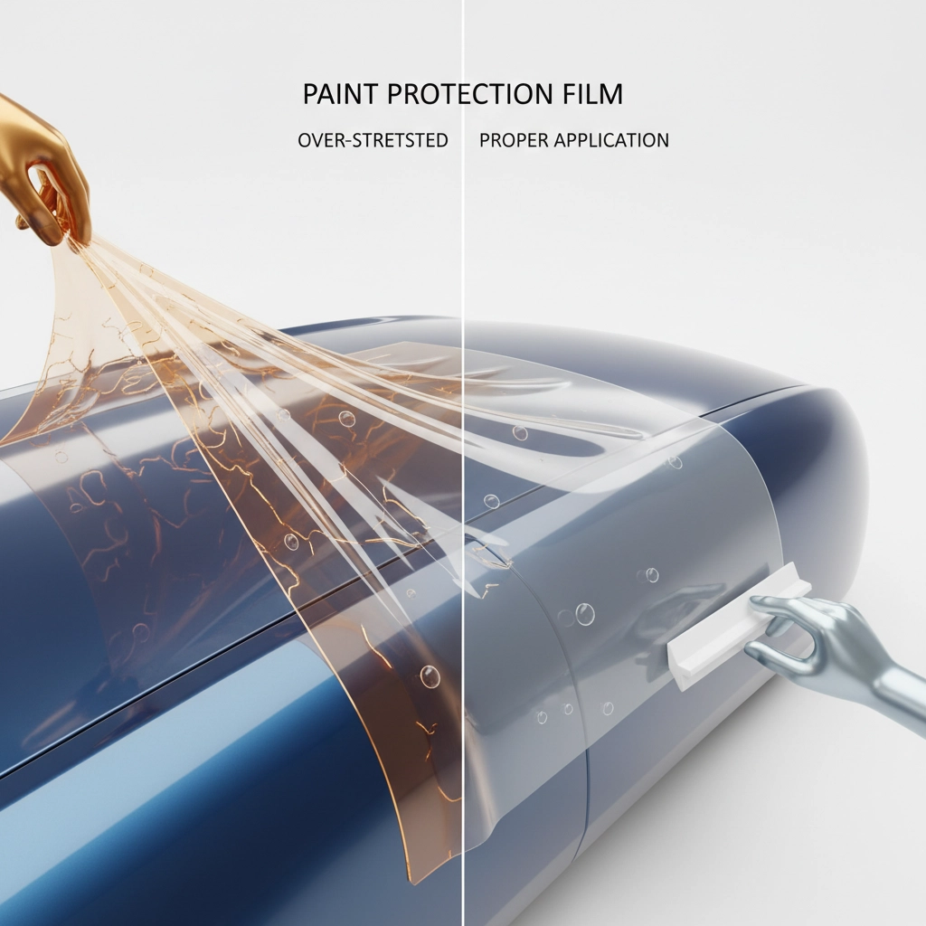 Over-stretched PPF loses its protective properties, creates stress points that fail over time, and often results in visible distortion or “orange peel” effects.
